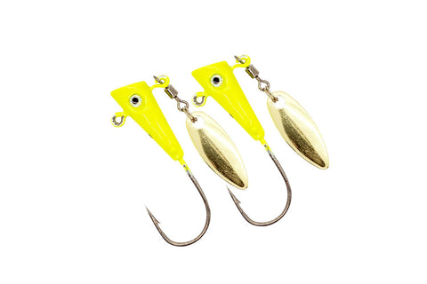 The Fin Spin blade will spin on the retrieve or the fall. The Shad dart shape creates a unique look and movement. Just add a Crappie Magnet body or any solid jig body to add realistic action. The Double Cross barbs will hold onto any jig body longer than any other jig spinner combo. You can cast or troll the Fin Spin.